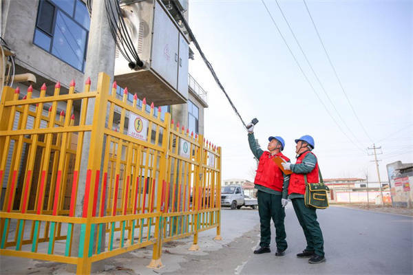 供电服务队员对屯头村内变压器进行巡视测温,排查安全隐患,确保供电设备健康运行。赵亚龙摄