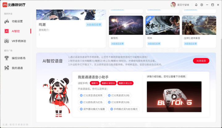 这款手柄的另外一大王炸就是北通独家的AI语音2.0,只要连接的设备有麦克风并关闭外设助手保持北通游戏厅的运行,就可以通过语音对手柄进行设置,无需退出游戏,只需要一句"你好,通通"或长按3s AI键即可唤醒语音助手,"把扳机震动调至4档,灯光调整成流光"一句话调整多个参数,识别准确率和指令修改成功率高达99%,这比任何的“外挂”都强。而这颗继承宙斯2的经典AI键,只需短按1s即可在游戏中呼出轮盘,直接进行游戏加速、截图、录屏等操作。