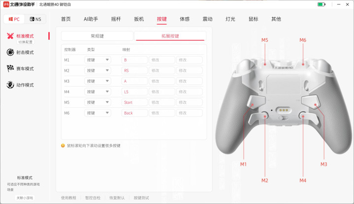 搭配北通游戏厅APP,还能实现更深度的个性化调节:自定义键位映射、设置摇杆曲线、调整震动强度,甚至支持宏定义录制,将复杂连招一键触发,无论是轻度玩家还是硬核玩家都能找到适合自己的配置方案。还有14款训练小游戏,帮助你快速熟悉手柄配置,快速上手。
