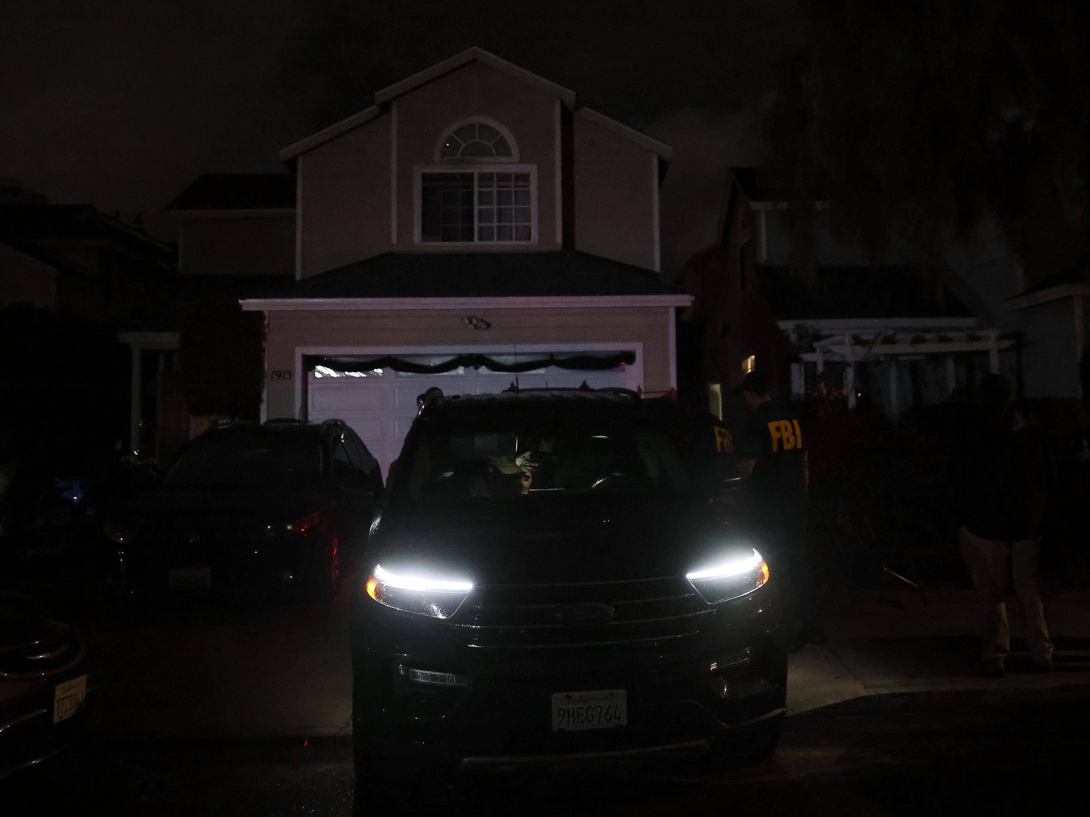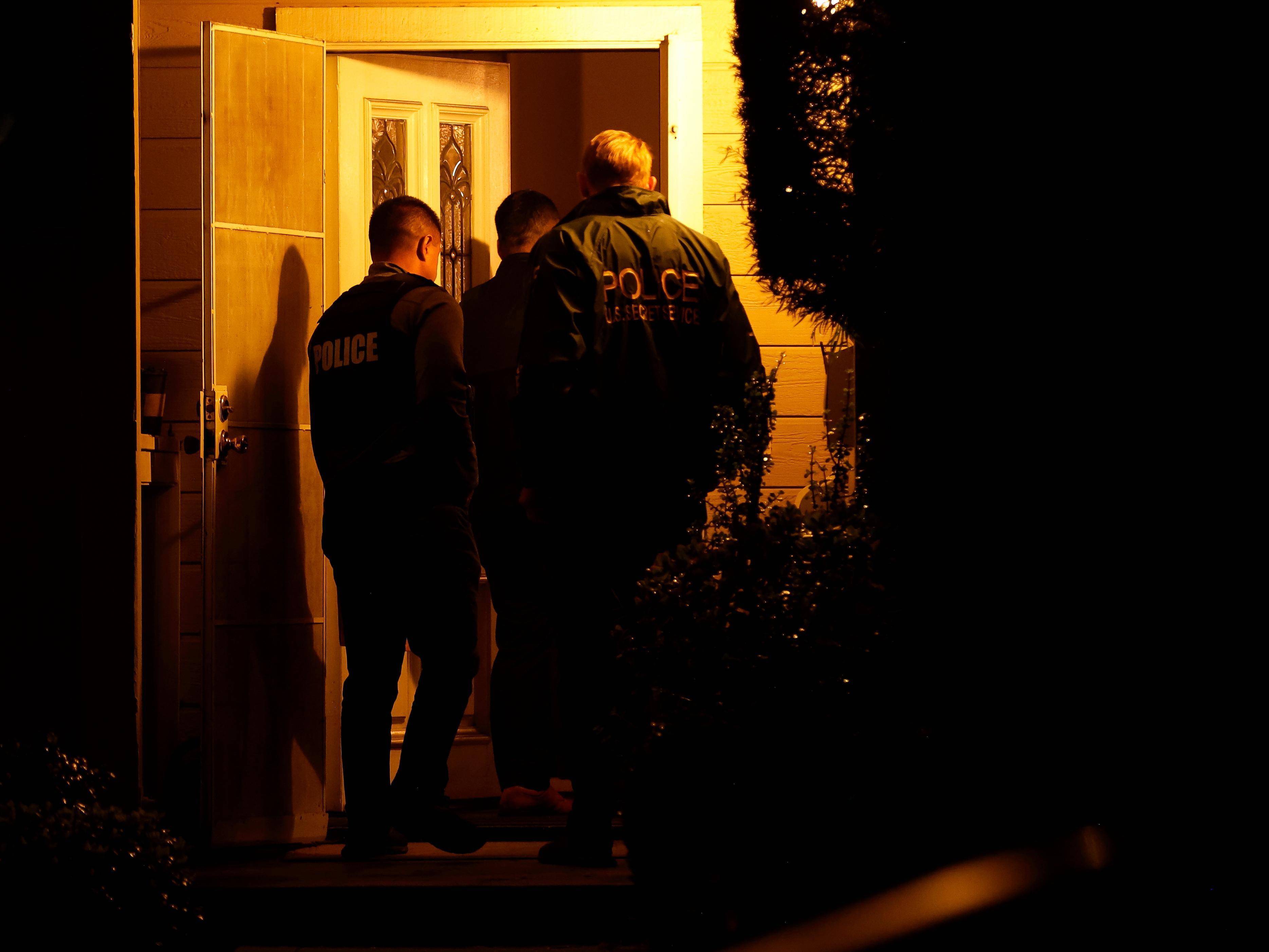 ↑4月26日凌晨,在美国加利福尼亚州托兰斯市,联邦调查局探员进入科尔·艾伦的住所搜查。